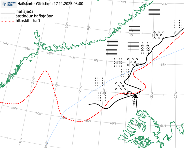 Hafískort dregið eftir myndum úr Sentinel-1 gervitunglinu sem teknar voru að morgni 16. nóvember. Jaðarinn er næst landi 40 sjómílum norður af Straumsnesi. Næstu daga er útlit fyrir suðvestanátt á svæðinu og þá mun jaðarinn færast nær landi en í lok vikunnar snýst í norðaustanátt og þá ætti jaðarinn að fjarlægast Ísland.