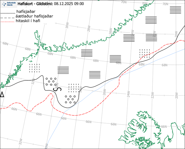 Hafískort dregið eftir myndum úr Sentinel 1 tunglinu sem voru teknar 7. og 8. desember 2025. Meginísröndin heldur sig rétt utan við lögsögu landsins. Næstu daga er útlit fyrir ákveðnar norðaustlægar áttir á svæðinu sem mun að mestu bægja hafís frá Íslandi. Þó eru líkur á að stöku borgarísjaki gæti rekið nær landi.