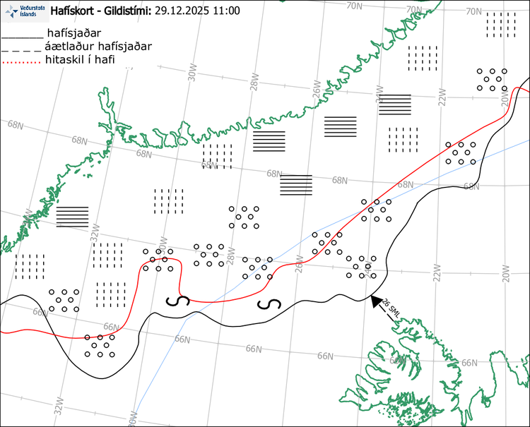 Hafískort dregið eftir gervitunglamyndum frá 28. og 29. desember úr Sentinel 1 tunglinu. Hafísjaðarinn er næstur landi 26 sjómílur norðvestur af Straumnesi. Næstu daga verða suðvestan- og síðar vestanáttir ríkjandi og því gæti hafísjaðarinn, ásamt stökum borgarísjökum, færst nær Íslandi.