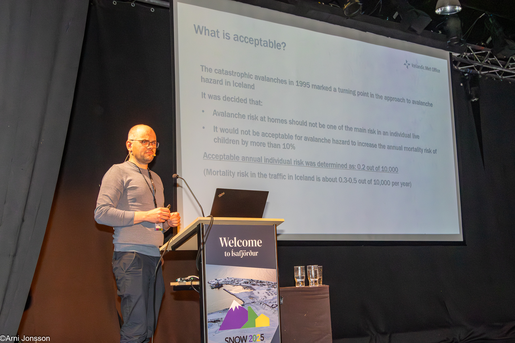 Óliver Hilmarsson, sérfræðingur á sviði snjóflóða á Veðurstofu Íslands, ræddi tímabundnar áhættuminnkandi aðgerðir á snjóflóðasvæðum á ráðstefnunni SNOW2025 á Ísafirði.Mynd:Árni Jónsson.