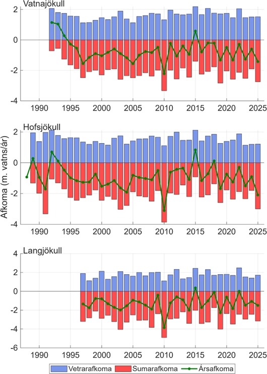 Mæld yfirborðsafkoma þriggja stærstu jökla landsins.