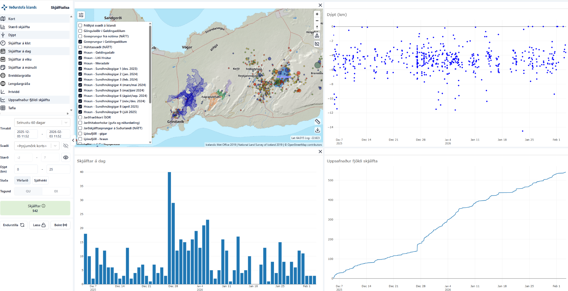Ný Skjálftalísa Veðurstofu Íslands, byggð á gögnum úr SeisComP-kerfinu, sýnir hér jarðskjálftavirkni á korti ásamt greiningu á dýpt, tíðni og þróun skjálfta í tíma.