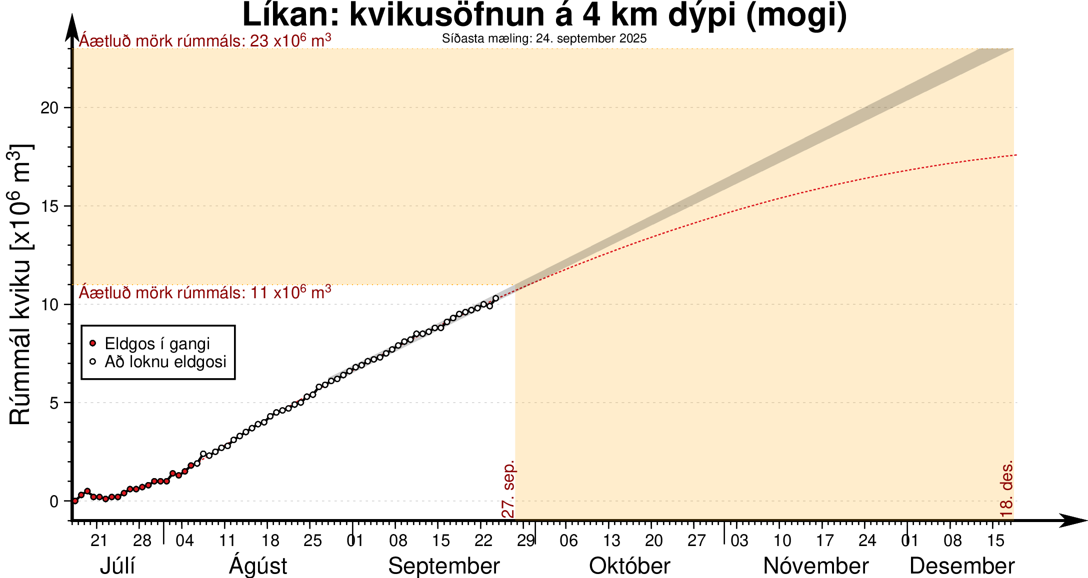 Líkurnar á nýjum atburði aukast þegar um 11 milljónir rúmmetra hafa safnast saman sem næst í lok september. Þó er áfram töluverð óvissa.