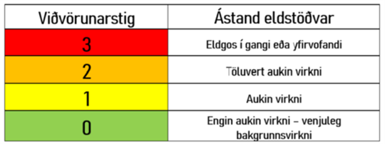 Veðurstofan heldur utan um viðvörunarstig eldfjalla á Íslandi sem kallast VALS – Volcanic Alert Level System. Það hefur fjögur stig: