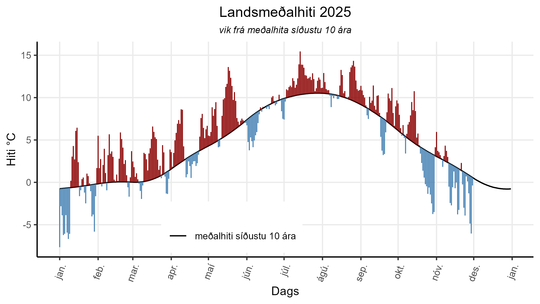 Á mynd 2 má sjá landsmeðalhita hvers dags það sem af er ári 2025, sem vik frá meðalhita síðustu tíu ára. Það var hlýrra en að meðallagi í byrjun mánaðar, en flesta aðra daga var hiti vel undir meðallagi síðustu tíu ára.
