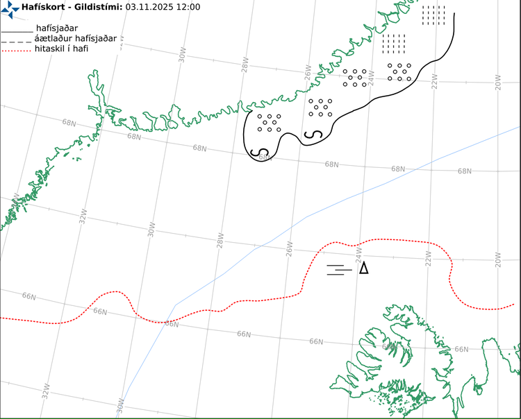 Ekki sést greinilegur hafís á gervitunglamyndum, en hafís er þó líklega tekinn að myndast við strendur Grænlands. Líklega má finna borgarísjaka á víð og dreif á svæðinu. Spáð er norðaustlægum áttum næstu daga.