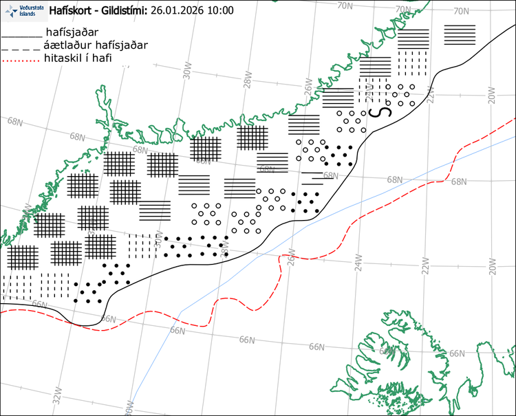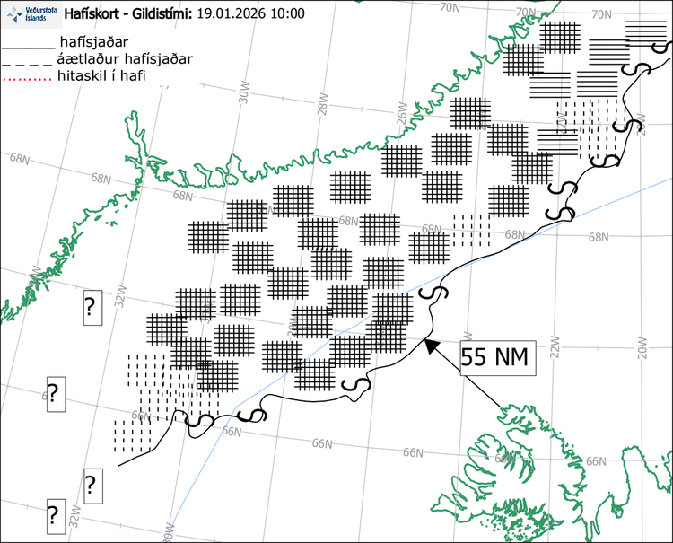 Hafískort var teiknað eftir SAR gervitunglamynd frá kl. 8:21 í dag, mán. 19. janúar 2026. Greina mátti stærstan hluta af meginísröndinni á tunglmyndinni og mældist hún í um 55 sjómílna fjarlægð frá Straumnesi þar sem hún var næst landi. Ísspangir og stakir jakar geta verið handan meginlínunnar nær landi.