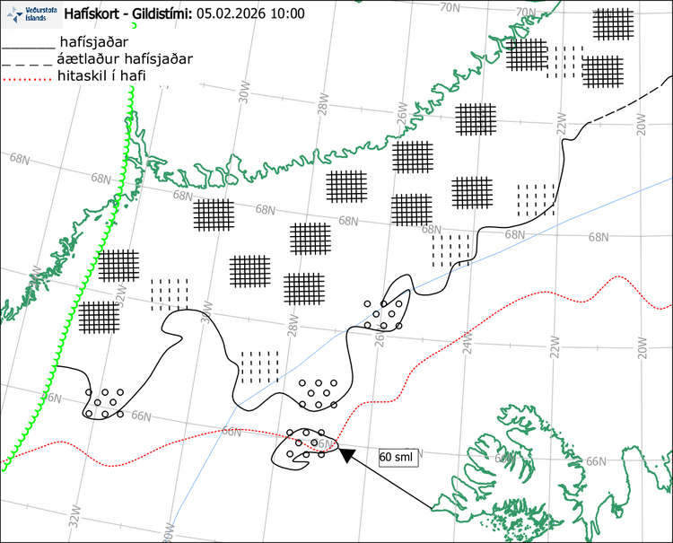 Ísrönd 60 sjómílur VNV af Kópanesi, liggur til NA.