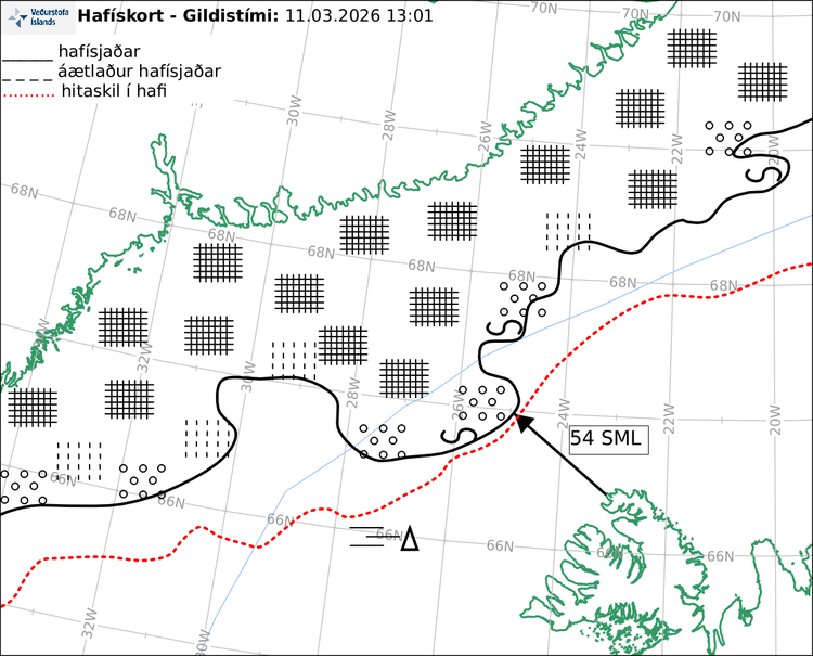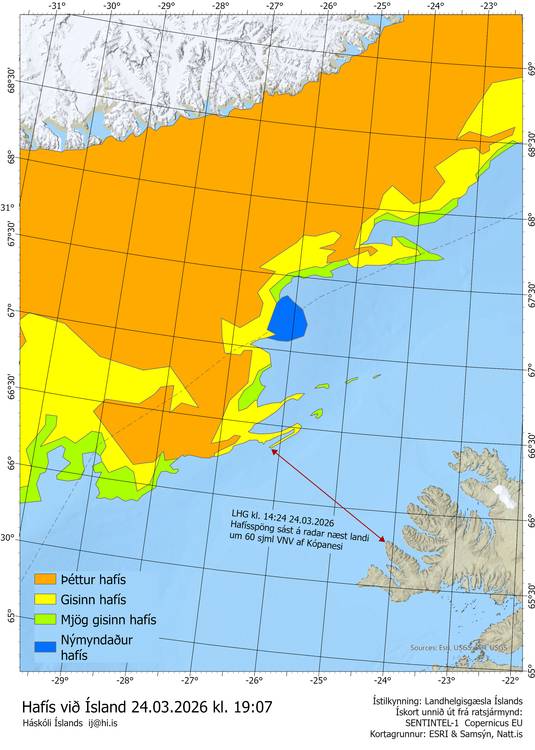 Hafísjaðarinn er um 60 SML vestnorðvestur af Kópanesi. |