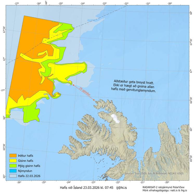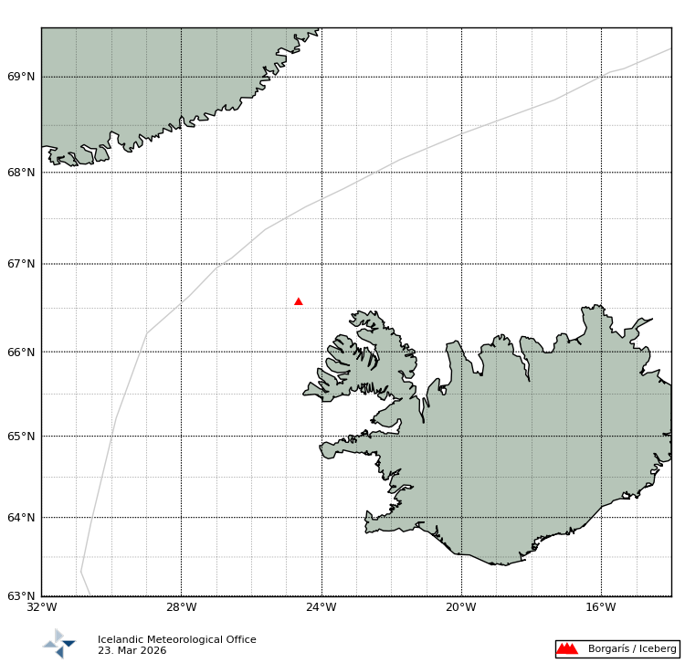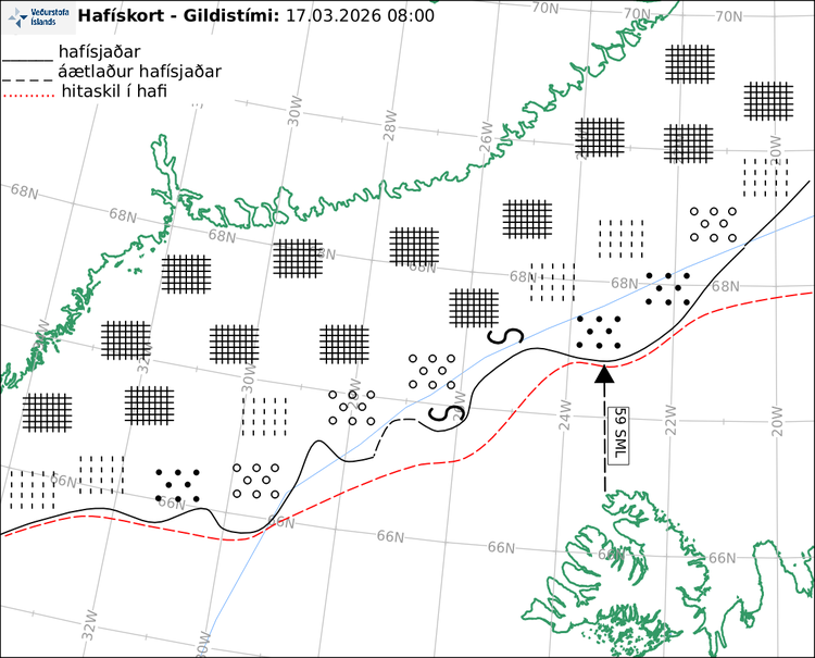 Hafískort byggir á SEVERI1 gervitunglamyndum frá 15. og 16. mars. Hafísröndin er víða fyrir innan miðlínu norðvestan við landið og er um 59 SML út frá Straumnesi þar sem hafísröndin er næst landi. Í dag eru ríkjandi norðaustanáttir á svæðinu og því ætti hann að ekki að færast mikið, en á morgun gengur í ákveðna sunnan- og suðvestanátt og þá gæti hafísröndin færst nær landi. Líkur á borgarís eru víða.