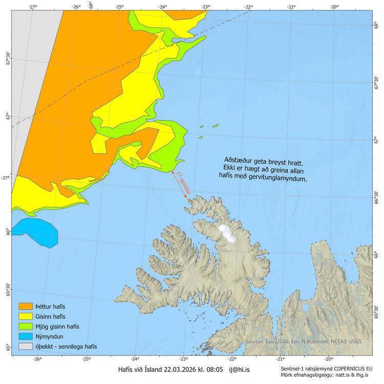 Ískort unnið út frá ratsjármynd og upplýsingum úr þyrlu fyrr í dag. Litlir flekkir með mjög gisnum ís en þéttum spöngum inn á milli voru þá í 42 sjómílna fjarlægð VNV - NV af Straumnesi.