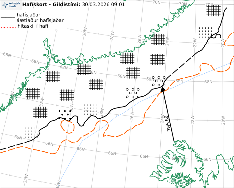 Hafísjaðarinn er um 60 SML vestnorðvestur af Kópanesi. |