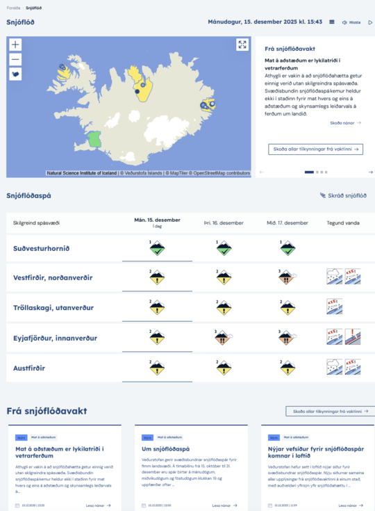 Veðurstofan hefur sett nýjar síður fyrir svæðisbundnar snjóflóðaspár í loftið. Nýja síðan er miðlægur vettvangur fyrir allar upplýsingar frá snjóflóðavaktinni, þar sem snjóflóðahætta er sett fram á skýran og aðgengilegan hátt, með kortum, spám og vöktun. Framsetningin á spám og kortum er einnig hönnuð með þarfir farsímanotenda í huga og með bættum og þysjanlegum kortum og fleiri gagnvirkum þekjum.
