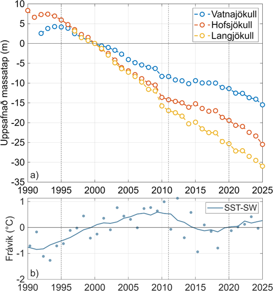 Uppsöfnuð yfirborðsafkoma Vatnajökuls, Hofsjökuls og Langjökuls frá árinu 2000. b) Frávik sjávarhita suðvestan við Ísland (60° - 65° N og 30°- 20° W) m.v. tímabilið 1990 – 2020.