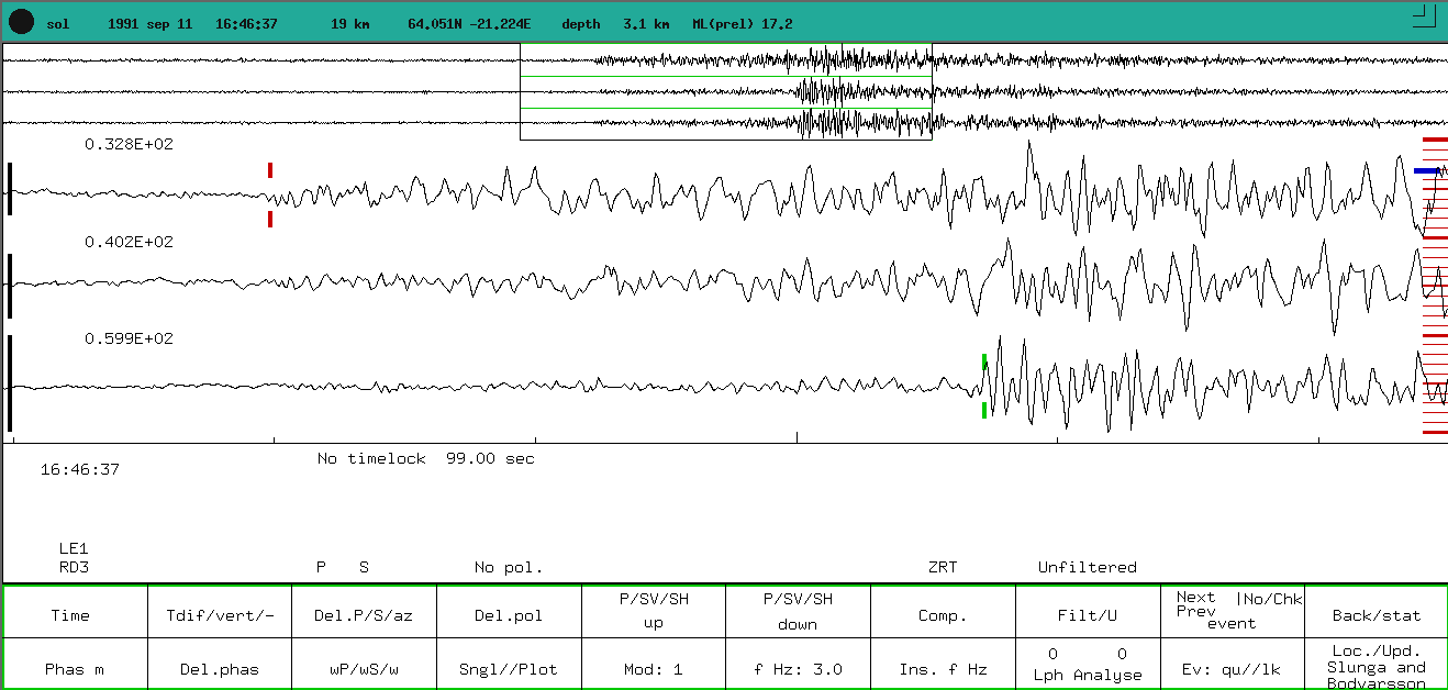Dæmi um jarðskjálftaskráningu í SIL-kerfinu, þar sem P- og S-bylgjur eru greindar handvirkt. Kerfið var tekið í notkun árið 1991 og hefur verið hornsteinn jarðskjálftavöktunar á Íslandi í rúma þrjá áratugi en víkur nú fyrir SeisComp.