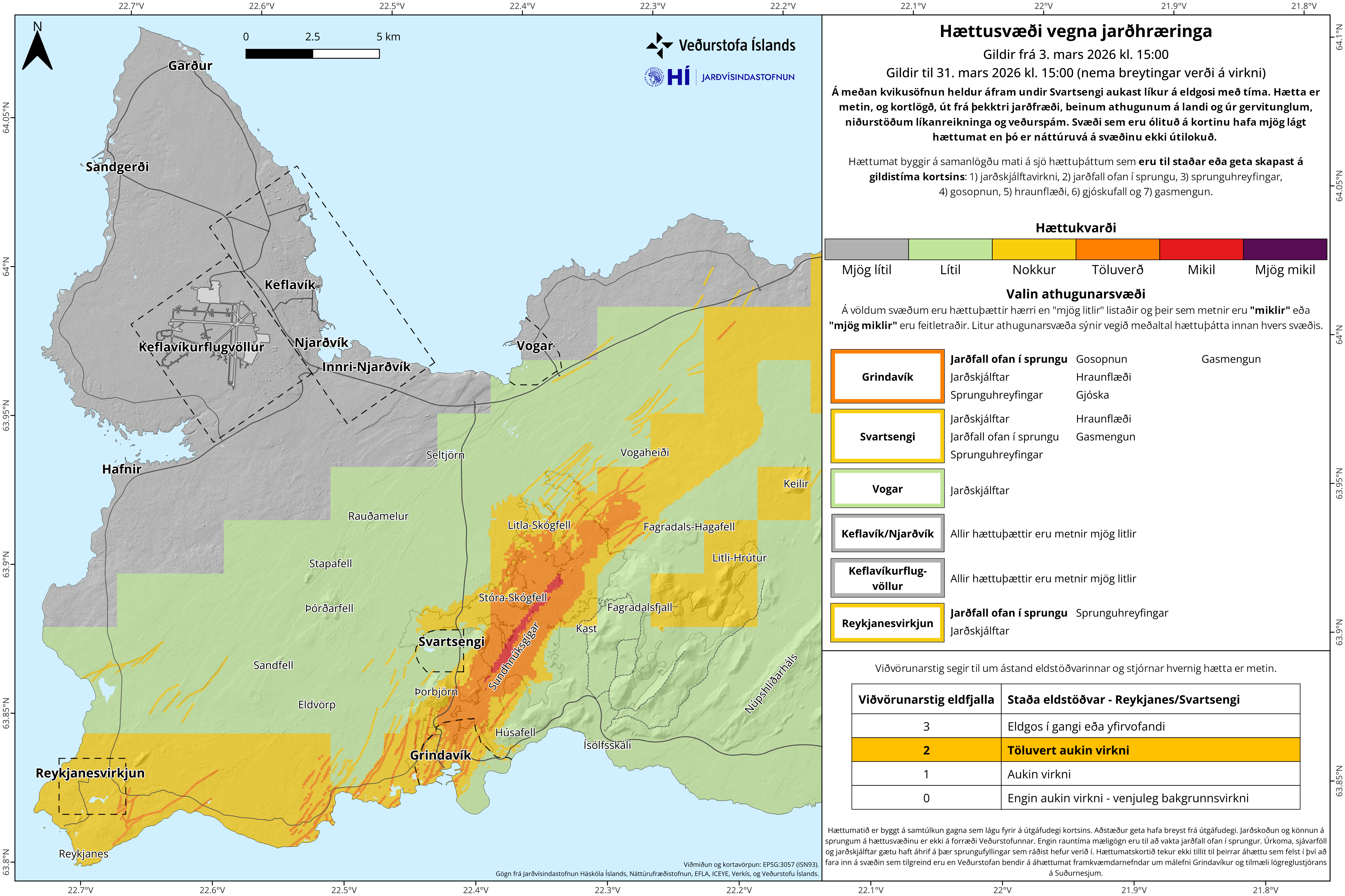 Hættumat Veðurstofunnar er óbreytt og hefur gildistíminn verið framlengdur til 31. mars. Veðurstofan heldur áfram að fylgjast náið með þróuninni og uppfærir hættumatið ef breytingar verða á virkninni.
