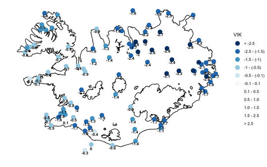 | Reykjavík | 1,9 | -0,4 | 68 | 155 | -0,8 |